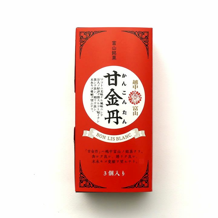 他の画像を見る 越中富山の銘菓として愛され続ける「甘金丹」(かんこんたん) 富山銘菓 甘金丹(かんこんたん) 3個入(小箱なし)(※熨斗掛け不可) 当店特別価格 ¥ 788 税込 ふわふわのスポンジに濃厚なクリーム、幅広い年代から支持される当店の定番商品です カートに入れる お気に入りに登録する
