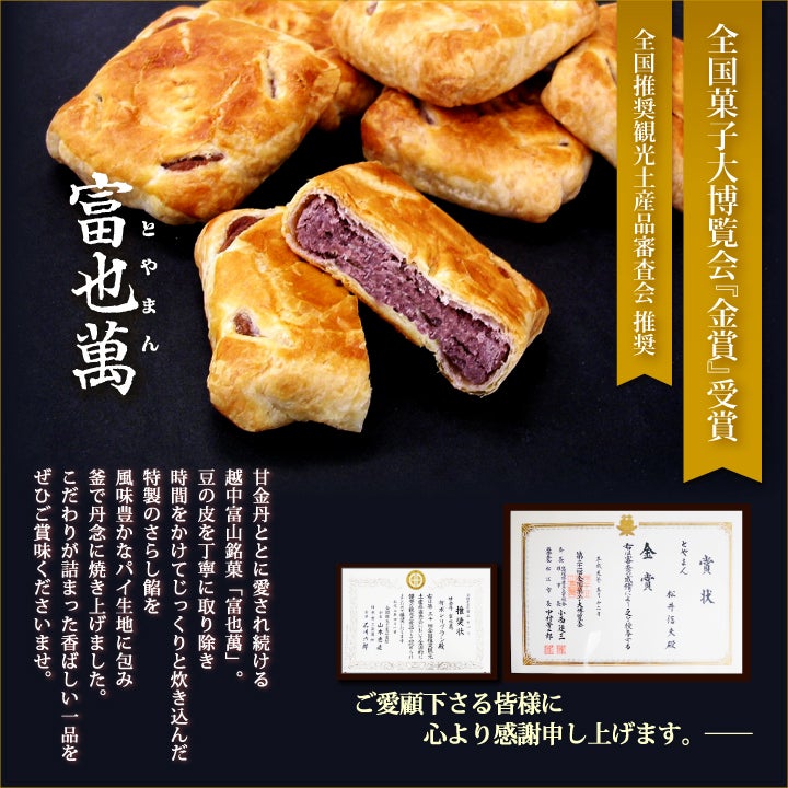 他の画像を見る 北海道産の小豆餡をパイで包みました 富山銘菓 富也萬(とやまん) 富山銘菓 富也萬(とやまん) 12個入り 小箱入り 当店特別価格 ¥ 3,380 税込 小豆のあくがなく、かつ風味を奪いすぎず、あっさりとした甘みがパイの中に詰まっております カートに入れる お気に入りに登録する